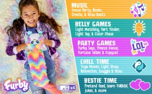 • CREATE 1000+ PLAY COMBOS WITH 5 MODES: Create custom music, remix and hear Furby songs (they’re such a bop), play games, chill with breathing and yoga moves, and more. Speaks English and Furbish
